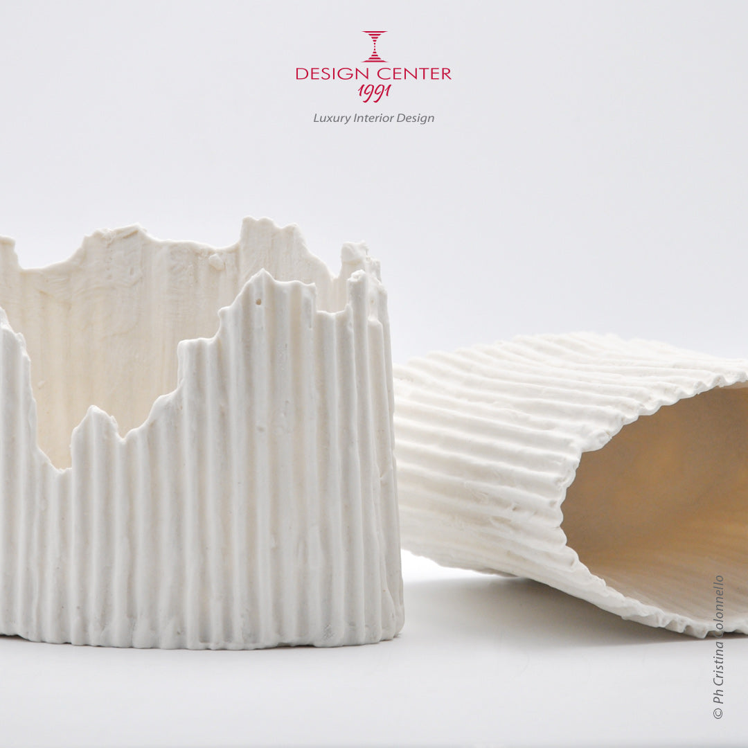 Nei vasi della collezione Paesaggio sotto la luna purezza e ruvidità si intrecciano, trasformando la fragilità della materia in eleganza scultorea.